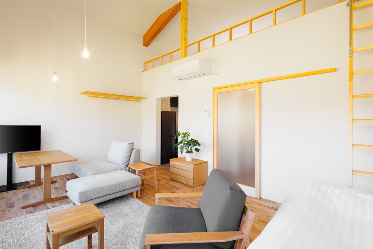 ・ソファーダイニング ・ワークデスク ・リビングチェア×3 ・冷蔵庫 ・電子レンジ ・キッチン ・バスルーム(独立タイプ) ・トイレ(ウォシュレット) ・冷暖房 ・マットレス×4 ・Wi-Fi ・テレビ ・タオル(ハンド、フェイス、バス) ・ドライヤー ・湯沸しポット ・パジャマ ・室内用スリッパ