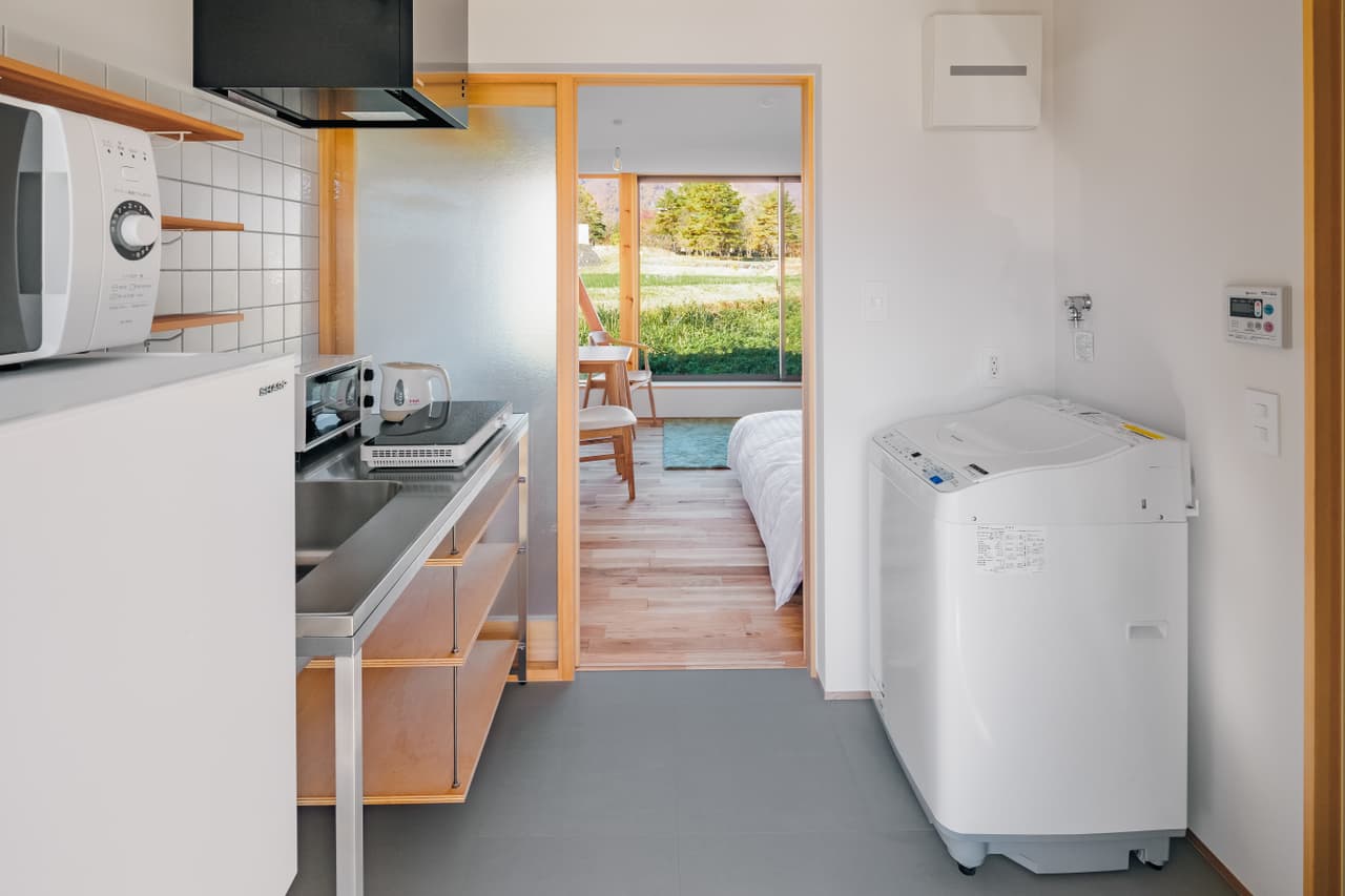 ・ソファーダイニング ・ワークデスク ・パーソナルチェア×2 ・リビングチェア×2 ・冷蔵庫 ・電子レンジ ・キッチン ・バスルーム(独立タイプ) ・トイレ(ウォシュレット) ・冷暖房 ・ベッド×2 ・マットレス×3 ・Wi-Fi ・テレビ ・タオル(ハンド、フェイス、バス) ・ドライヤー ・湯沸しポット ・パジャマ ・室内用スリッパ